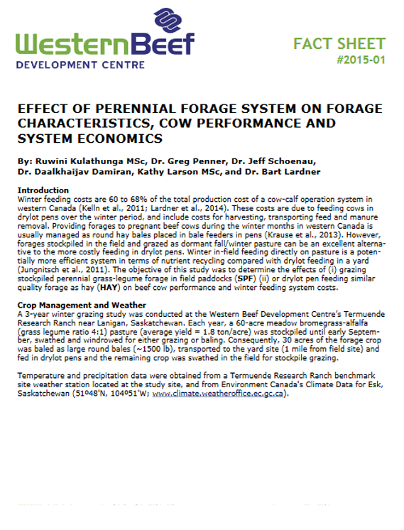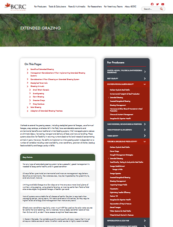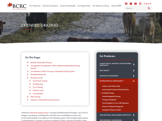 An article from the Beef Cattle Research Council (BCRC). Methods to extend the grazing season, including stockpiled perennial forages, use of annual forages, crop residues, and bale feeding in-field.