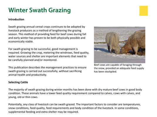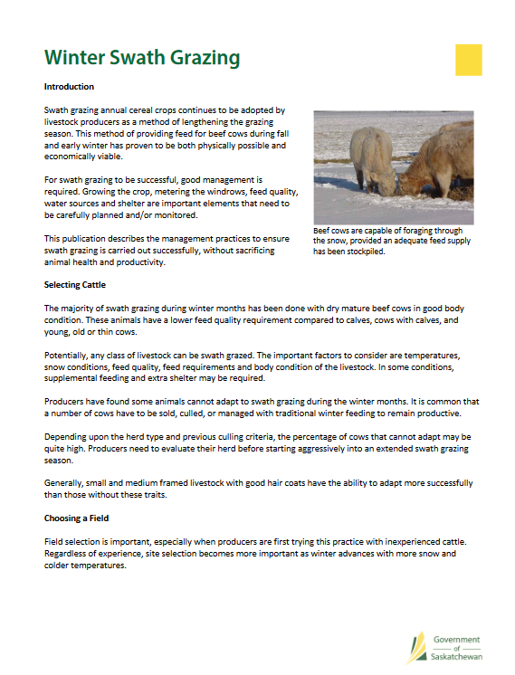 An article from Saskatchewan Agriculture. Planning for winter swath grazing, including crop selection and management considerations.